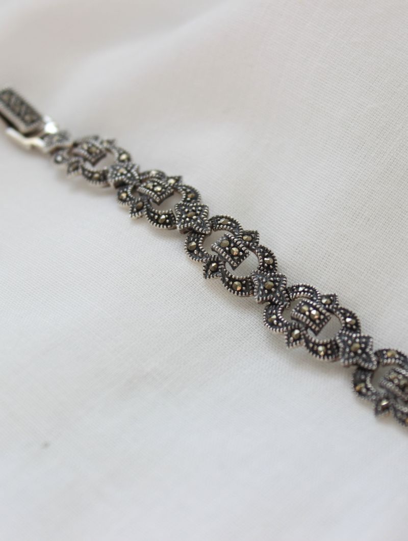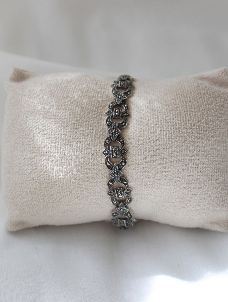 Pulsera de marquesitas en plata de 1ª ley envejecida con diseño calado de eslabones. Cierre de caja en plata para un ajuste seguro y cómodo.